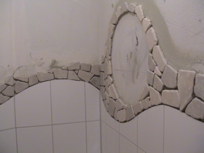Hier sehen Sie Badezimmergestaltung während den Arbeiten. Deutlich ist die Aussparung für einen Spiegel zu erkennen.